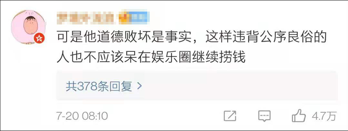 “这种人不会带坏青少年的价值观吗?”“违背公序良俗的人不应该呆在娱乐圈继续捞钱。”