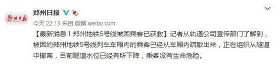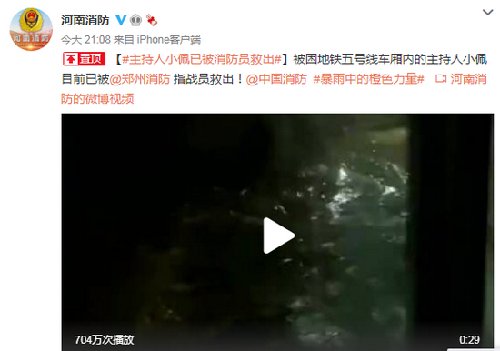 晚9时许,河南消防官方微博发布消息称,被困郑州地铁5号线车厢内的主持人小佩等一行乘客目前已被郑州消防指战员救出。