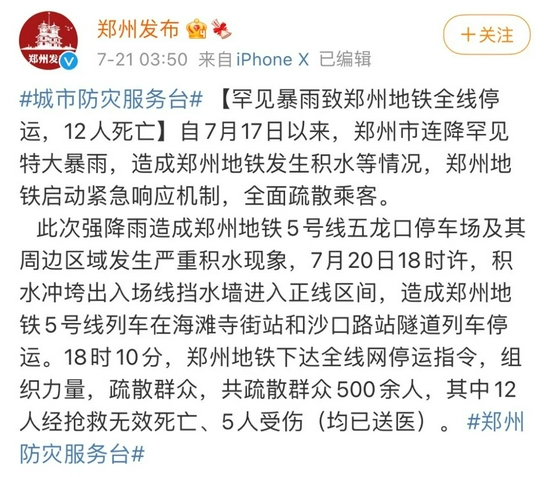 据@郑州发布 今天凌晨3时50分发布最新消息:自7月17日以来,郑州市连降罕见特大暴雨,造成郑州地铁发生积水等情况,郑州地铁启动紧急响应机制,全面疏散乘客。