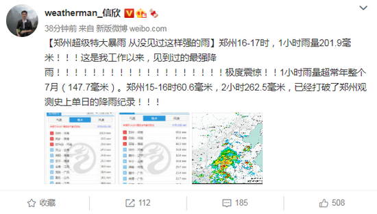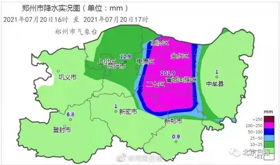 郑州气象局对这次特大暴雨做了一个数据的梳理和总结:郑州20日16时~17时,一个小时的降雨量达到了201.9mm。有杭州网友算了一下,这个数字相当于103个西湖倒进了郑州……