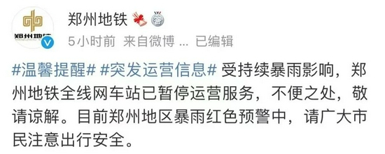 据郑州市轨道交通有限公司官方微博@郑州地铁 7月20日发布的消息:受持续暴雨影响,郑州地铁全线网车站已暂停运营服务。