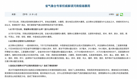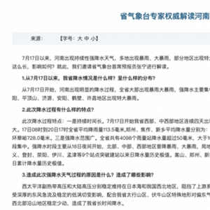 河南气象台工作人员称,可关注省气象局官网上的《省气象台专家权威解读河南极端暴雨》,由省气象台首席预报员张宁进行解读。