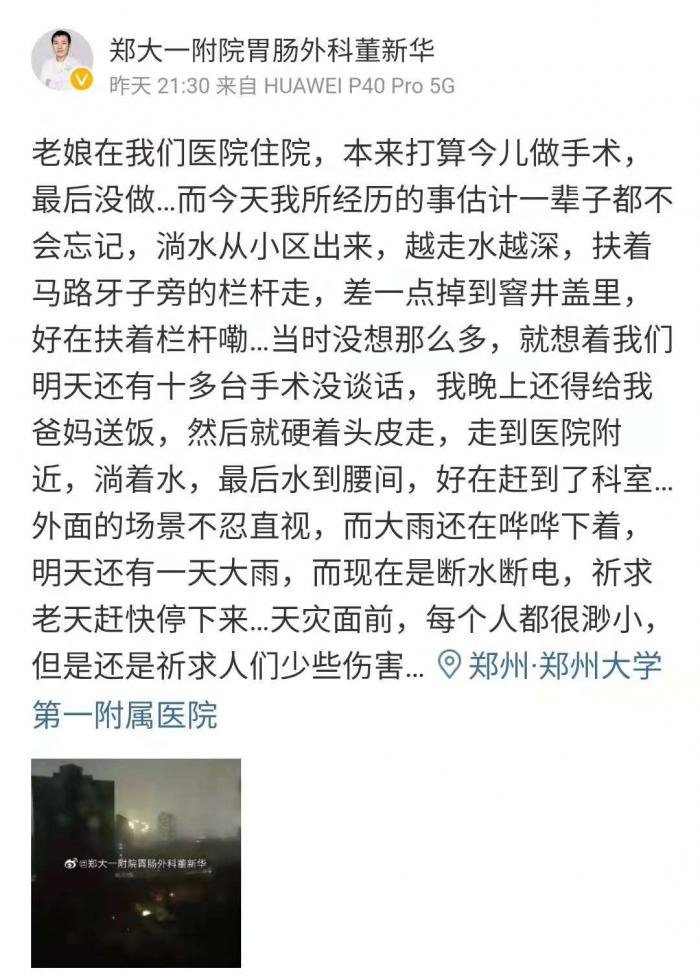 据微博认证为“郑大一附院胃肠外科董新华”的医生也公开发布了当时的情况。董新华称他的母亲在该医院住院,原本7月20日要做手术,但最后没有做成,一些教授也被困门诊。
