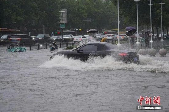 7月20日,河南郑州,车辆经过积水路段。近日,郑州连遭暴雨袭击,持续强降雨导致部分街道积水严重。 中新社记者 阚力 摄