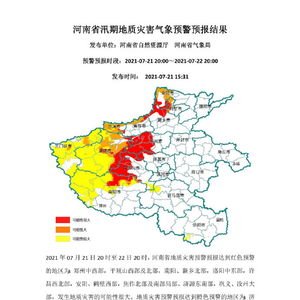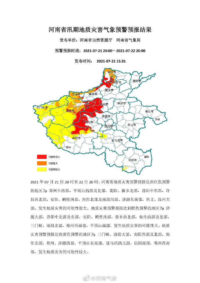 @河南气象 微博消息,2021年07月21日20时至22日20时,河南省地质灾害预警预报达到红色预警的地区为:郑州中西部,平顶山西部及北部,南阳、新乡北部,洛阳中东部,许昌西北部,安阳、鹤壁西部,焦作北部及南部局部、济源东南部,巩义、汝州大部,发生地质灾害的可能性很大。地质灾害预报达到黄色预警的地区为:三门峡、洛阳大部,南阳西部及北部,焦作北部,郑州、济源西部,平顶山东南部,信阳南部,邓州西南部,发生地质灾害的可能性较大。