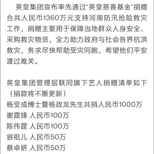据英皇娱乐(北京)官方微信公众号“英皇文化”7月21日消息, 英皇集团宣布通过“英皇慈善基金”捐赠合共人民币1360万元支持河南防汛抢险救灾工作。