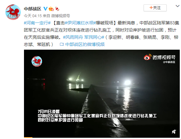 最新消息,中部战区陆军第83集团军工化旅官兵正在对坝体连夜进行钻孔施工,同时对沿岸护坡进行加固,预计在天亮后实施爆破。