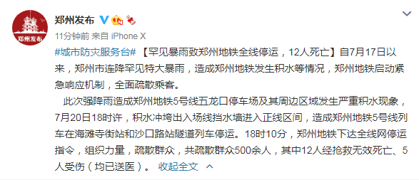郑州发布:罕见暴雨致郑州地铁全线停运,12人死亡