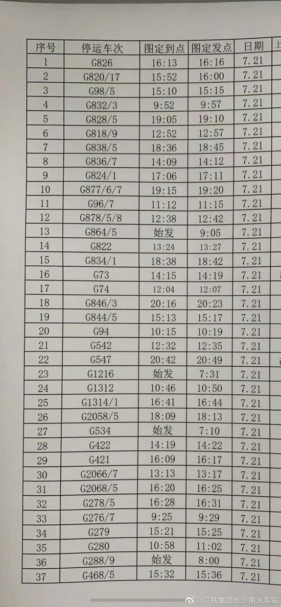 原标题:提醒!受河南强降雨影响,长沙火车南站75趟车次停运,涉及这些车次