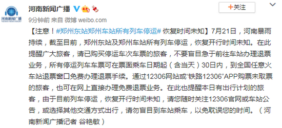 7月21日,河南暴雨持续,截至目前,郑州东站及郑州车站所有列车停运,恢复开行时间未知。在此提醒广大旅客,请已购买停运车次车票的旅客,不要盲目急于前往车站办理退票业务,所有停运列车车票可在票面乘车日期起(含当天)30日内,到全国任意火车站退票窗口免费办理退票手续。通过12306网站或“铁路12306”APP购票未取票的旅客,也可在网上直接办理免费退票业务。在此也提醒本日有出行计划的旅客,由于目前列车停运,恢复开行时间未知,请您随时关注12306官网或车站公告,或选择其他交通方式出行,请勿盲目到车站乘车,以免耽误您的时间。(河南新闻广播记者 谷艳敏)