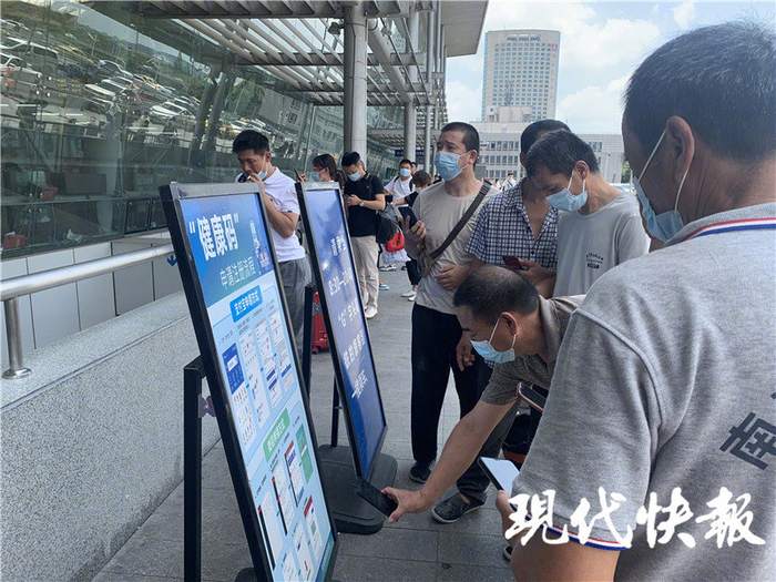 在南京南站进站口,每个门口前都有一到两名身着防护服的工作人员负责引导旅客,查验健康码。入口对面还设置了无健康码登记处,不少老年人在现场咨询。