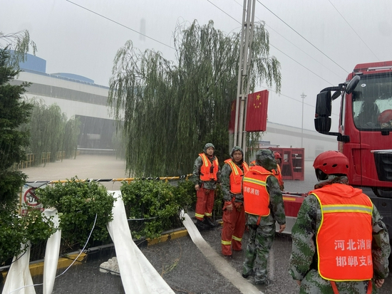 21日下午,距离郑州以北约168公里的安阳市汤阴县雨量持续增大,15时05分降雨量已达38.5mm。在安阳消防支队训练基地待命的邯郸消防支队部分指战员来到河南亚新钢铁集团有限公司,为该公司厂区排水。据了解,一条深5米的小河穿过该厂区,由于连降暴雨,河水已漫过河堤,厂区路面积水也不断增加。截止发稿前,邯郸消防支队仍在奋力排水中。