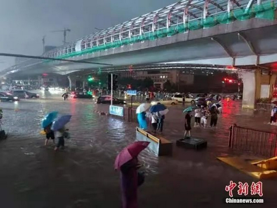 郑州市已提升防汛应急响应至I级,持续强降雨导致部分街道积水严重。中新社记者 阚力 摄