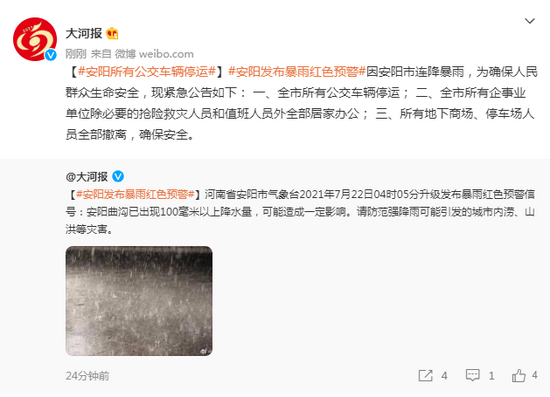 因安阳市连降暴雨,为确保人民群众生命安全,现紧急公告如下: 一、全市所有公交车辆停运; 二、全市所有企事业单位除必要的抢险救灾人员和值班人员外全部居家办公; 三、所有地下商场、停车场人员全部撤离,确保安全。@大河报