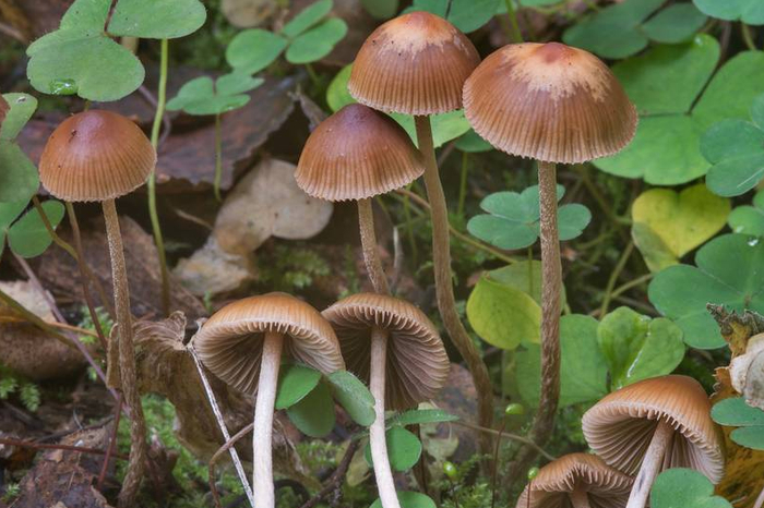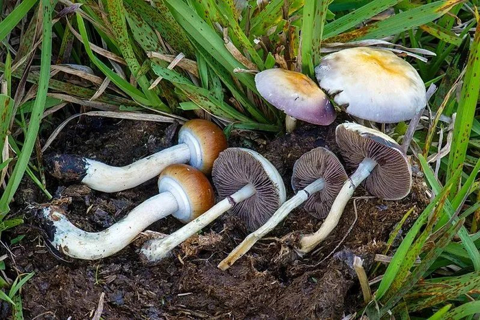 大部分裸盖菇有着白色的伞柄、褐色的伞盖,外表看起来平平无奇,但有些裸盖菇菌肉或菌柄受到损伤时会出现颜色变化,往往由白色变为蓝色。