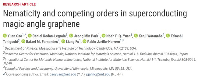 2021年7月21日,曹原作为第一作者和通讯作者在国际顶尖学术期刊Nature发表了题为:Pauli-limit violation and re-entrant superconductivity in moiré graphene 的研究论文。