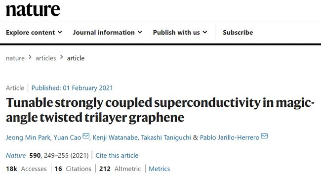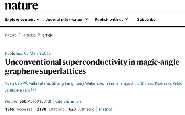 2018年3月5日,年仅22岁的曹原作为第一作者和共同通讯作者,在国际顶尖学术期刊Nature同期发表了两篇石墨烯重磅论文。文章刊登后立即在整个学界引起巨大反响。一些报道称其“一举解决了困扰世界107年的难题”。