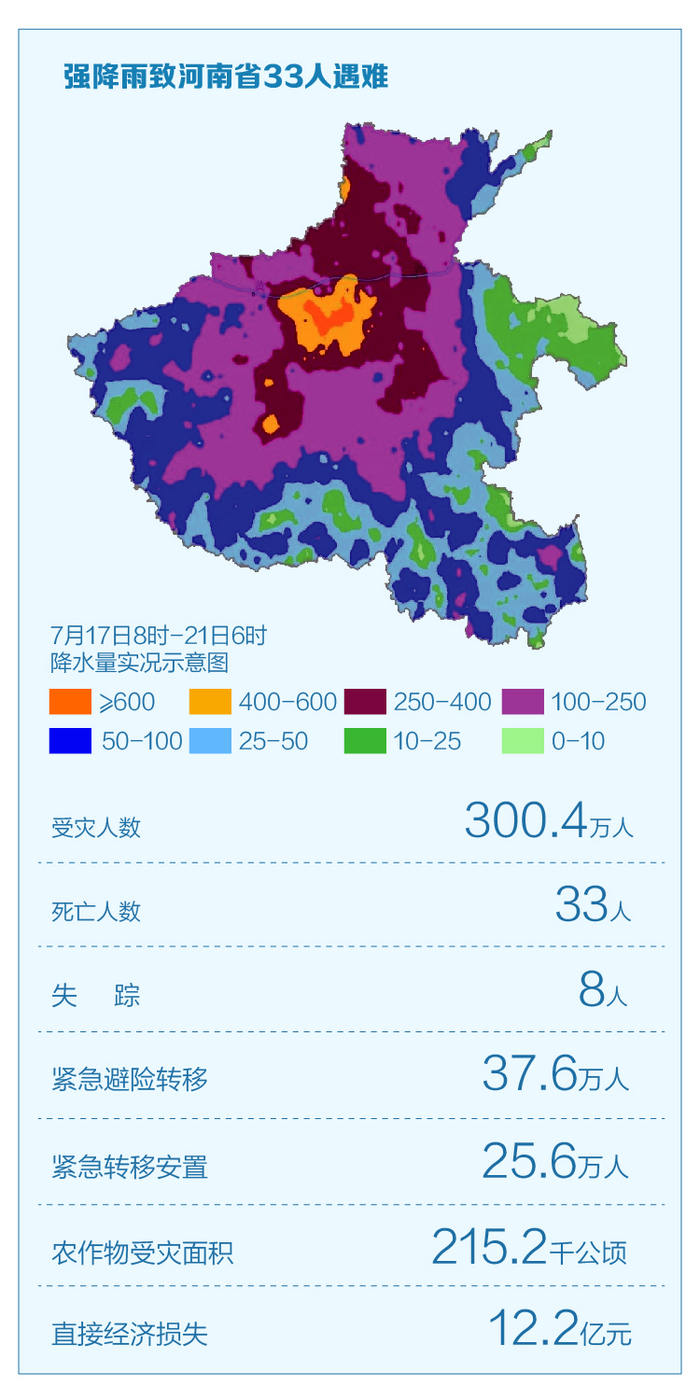 7月22日,记者从河南省应急管理厅获悉,16日以来,此轮强降雨造成全省103个县(市、区)877个乡镇300.4万人受灾,因灾死亡33人,失踪8人。