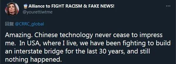 不出所料,境外社交平台上的用户们,纷纷借此批评美国。“太棒了,中国科技一直都让我震撼。但在我所居住的美国,我们过去30年里一直在努力建造一座州际大桥,但仍没有任何进展。”