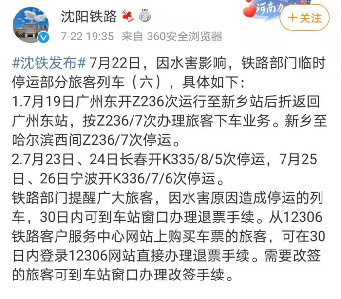 据沈阳铁路局官方微博7月22日19时许消息,因水害影响,铁路部门临时停运部分旅客列车,其中,7月19日广州东开Z236次运行至新乡站后折返回广州东站,按Z236/7次办理旅客下车业务。新乡至哈尔滨西间Z236/7次停运。