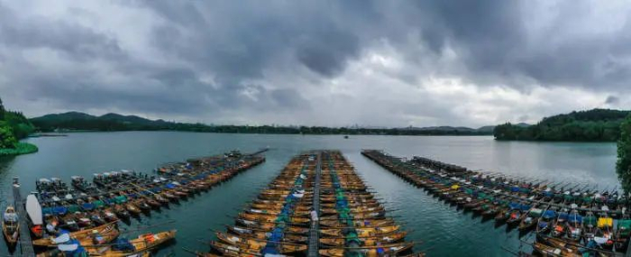 杭州西湖郭庄码头,成排的手划船、摇橹船停靠在岸边,暂停营业。