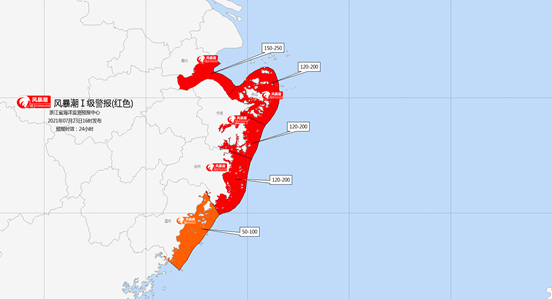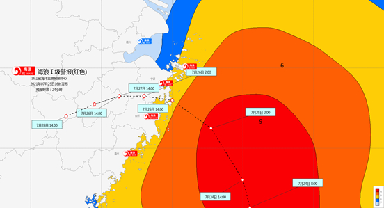浙江省海洋监测预报中心根据《海洋灾害应急预案》发布风暴潮Ⅰ级警报(红色)、海浪Ⅰ级警报(红色)。