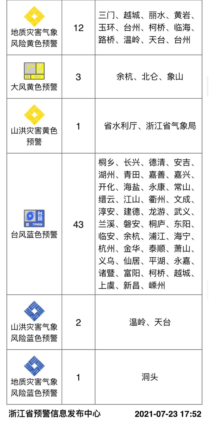 7月23日14时,省水利厅将水旱灾害防御(防台)应急响应提升至Ⅱ级。预计7月23日20时至24日20时,北仑区、鄞州区、柯桥区、新昌县、黄岩区、三门县、天台县、温岭市、临海市可能发生山洪灾害(蓝色预警),海曙区、奉化区、象山县、宁海县、余姚市、上虞区、嵊州市发生山洪灾害可能性较大(黄色预警)。