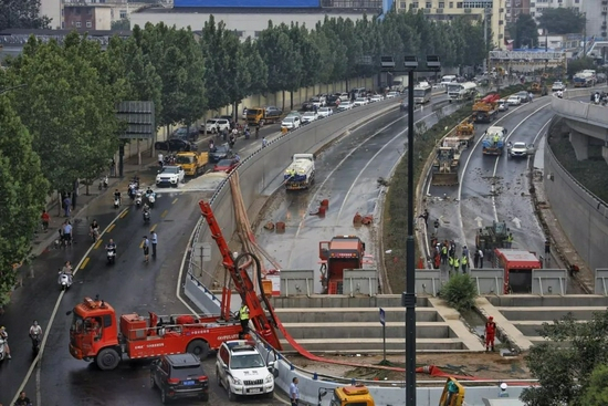 23日下午,备受瞩目的郑州市京广路隧道排水清淤抢险工作仍在紧锣密鼓地进行中(摄影:李昊)