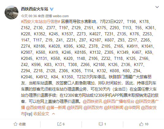 陕西省西安铁路局西安车站官方微博消息,因暴雨导致水害影响,7月23日K227、T198、K178、Z152、Z130、Z377、T197、Z129、Z151、K175、Z293、T113、T55、K361、K228、K1352、K245、K1537、Z273、K4027、T231、Z135、K176、Z253、1147、T117、Z19、Z41、Z231、Z87、K2187、K607、Z93、Z217、Z265、Z274、K8186、K4028、K595、k362、Z378、Z105、Z165、K4911、K1041、K2907、K560、K419、K246、K8185、K1132、Z305、K1349、K467、K59、K2045、K1131、K558、K420、1148、Z106、Z232、T118、K125、Z166、Z42、K596、K83、K131、T308、Z266、K2188、K126、Z136、K177、Z294、Z218、Z128、Z306、K305、T114、K132、K608、K60、Z94、K2046、K4912、K84、K1350、T232次列车停运。铁路部门提醒广大旅客朋友,当前车站退票、改签窗口人数急剧增加,排队时间较长,因此,持停运列车车票的旅客无须前往车站办理退票业务,可在30天内(含当日)在全国任意火车站办理原价退票手续;在12306官方网站或12306手机APP购票未取报销凭证的旅客,可以在网上直接办理原价退票。
