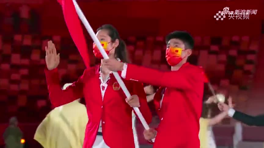 中国体育代表团入场 朱婷、赵帅高擎五星红旗