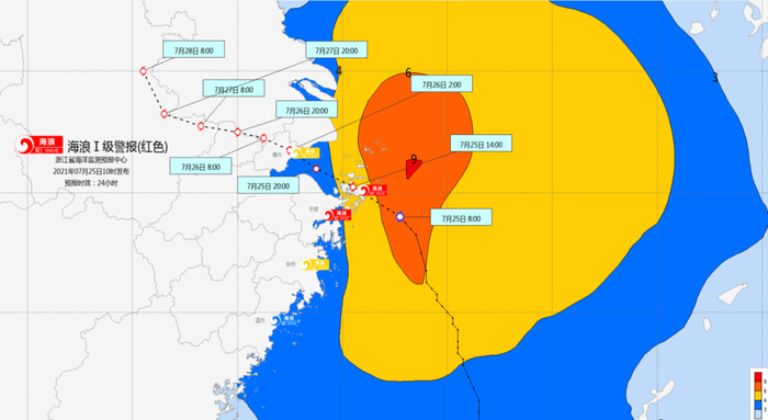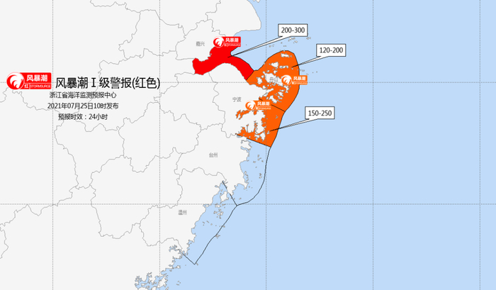 25日上午10时,浙江省海洋监测预报中心持续发布风暴潮、海浪红色警报。