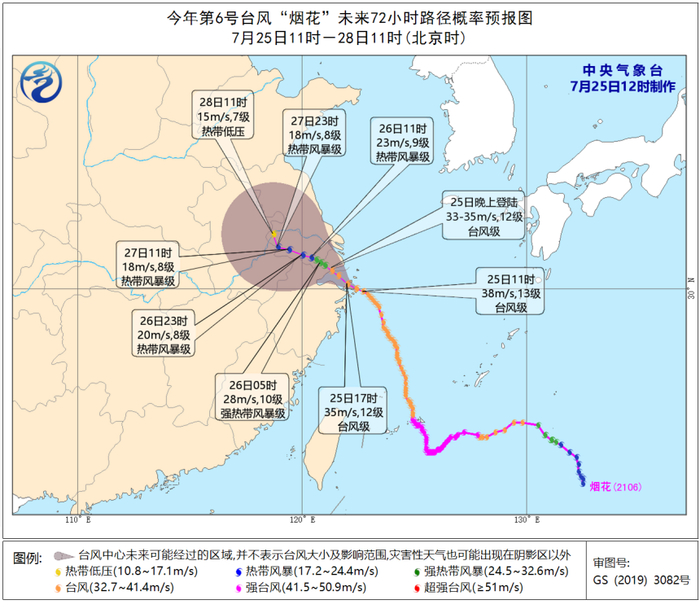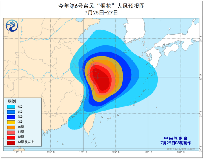 预计25日至27日,黄海南部、东海、台湾海峡及钓鱼岛附近海域、长江口区、杭州湾、江苏中南部及沿海、上海及沿海、浙江及沿海、福建中北部沿海、台湾岛西部沿海将有6~8级大风,阵风9~11级,其中东海大部、黄海西南部海域、浙江中北部及沿海、长江口区、杭州湾、上海及沿海、江苏东南部及沿海的风力有9~11级,阵风12~14级;“烟花”中心经过的附近海域或地区风力可达12~13级,阵风14~16级。