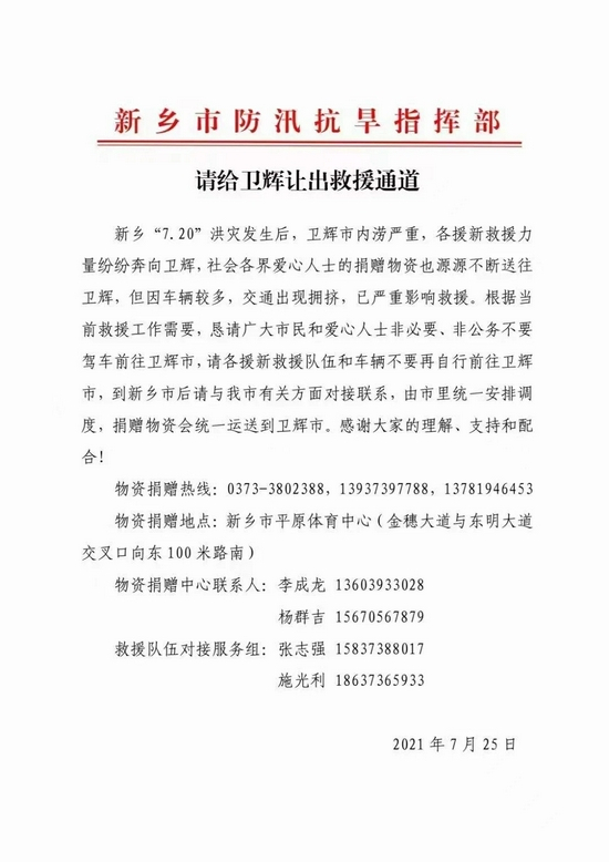 此前的7月25日,新乡市防汛抗旱指挥部发布了《请给卫辉让出救援通道》的通知,通知显示,目前河南新乡卫辉内涝严重,因车辆较多,交通出现拥挤,已严重影响救援。