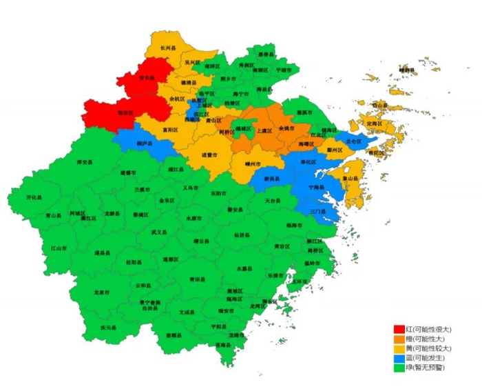 7月26日8时至2021年7月27日8时,杭州市(萧山区、临安区)、宁波市(海曙区、北仑区、余姚市)、湖州市(安吉县)、绍兴市(越城区、柯桥区、上虞区、诸暨市、嵊州市)、舟山市(定海区、普陀区、岱山县)等部分地区地质灾害气象风险很高(红色预警);杭州市(上城区、临平区、拱墅区、西湖区、滨江区、余杭区、富阳区)、宁波市(江北区、镇海区、鄞州区、奉化区、象山县、宁海县、慈溪市)、湖州市(吴兴区、南浔区、德清县、长兴县)、绍兴市(新昌县)、舟山市(嵊泗县)等部分地区地质灾害气象风险高(橙色预警);杭州市(桐庐县、淳安县、建德市)、金华市(婺城区、金东区、武义县、浦江县、磐安县、兰溪市、义乌市、东阳市、永康市)、台州市(椒江区、黄岩区、路桥区、三门县、天台县、仙居县、温岭市、临海市)、丽水市(缙云县)等部分地区地质灾害气象风险较高(黄色预警)。请密切关注雨量情况,做好地质灾害防范工作。
