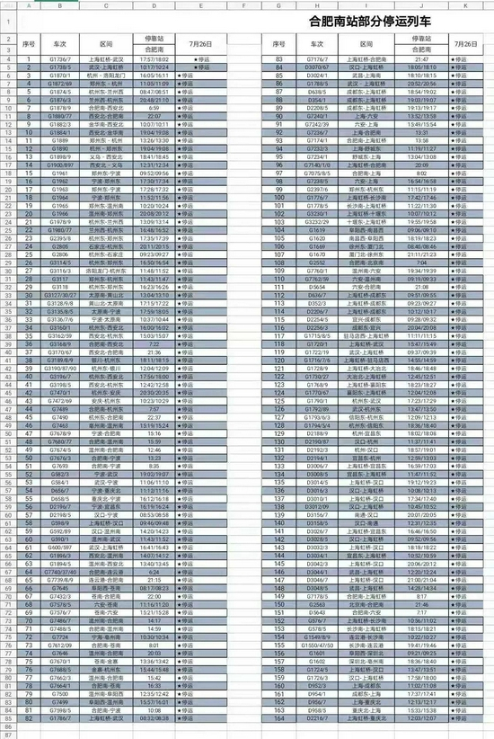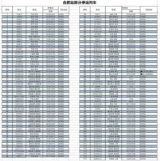 7月26日,受台风“烟花”以及郑州水害影响,合肥站和合肥南站多趟列车停运,刚刚合肥直属站梳理了部分停运列车车次信息。(可点击查看大图)