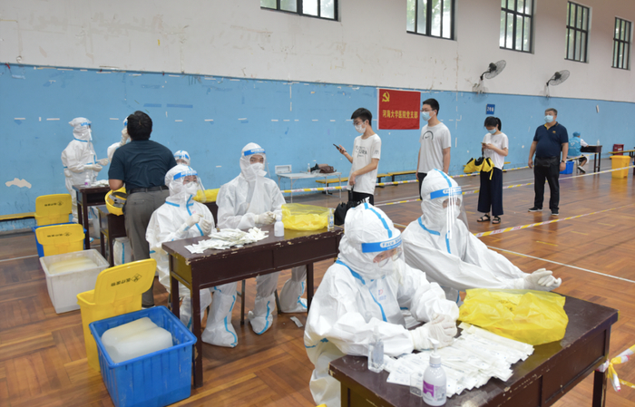 7月21号接到上级通知后,江宁校区仅用2个多小时就完成了准备工作,从白天到黑夜,在文体中心篮球馆完成了5030名在校师生员工的第一轮检测。西康路校区于7月22号连夜在工程馆和水利馆门口完成了3650人的第一轮检测。第一轮检测均为阴性。