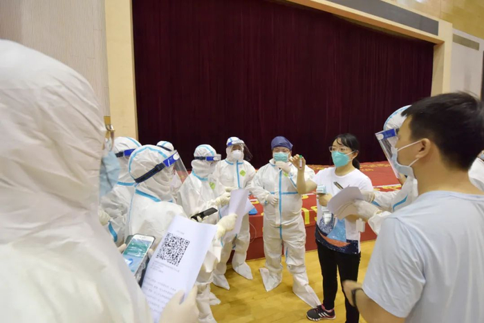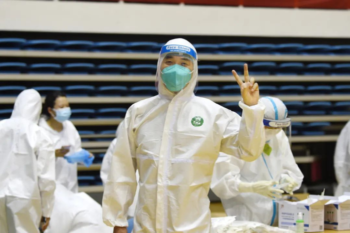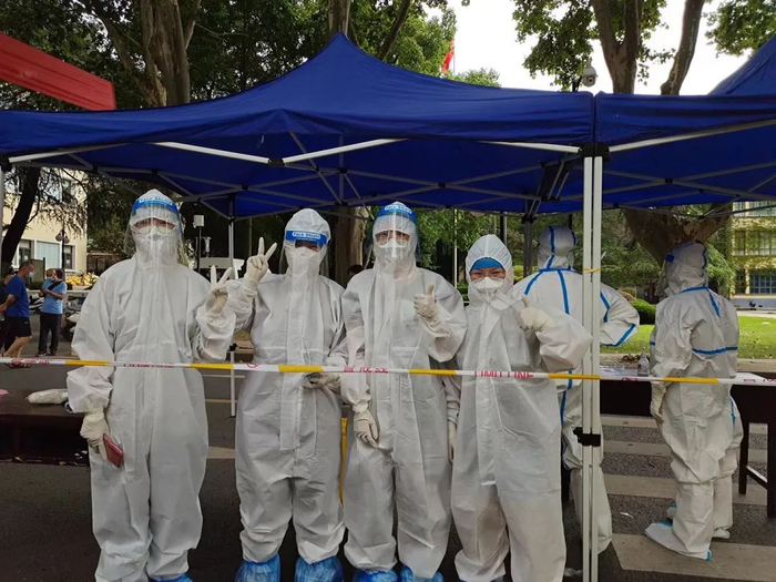炎炎夏日里,所有的医护人员和志愿者们身穿厚重防护服,戴护目镜和口罩,任凭头上的汗顺着脸颊淌下,也一丝不苟的继续工作,直到所有检测结束后,才脱下这套闷热的“战袍” ,像是卸甲归田的“战士”,脸上虽疲惫但掩盖不住的是笑意。