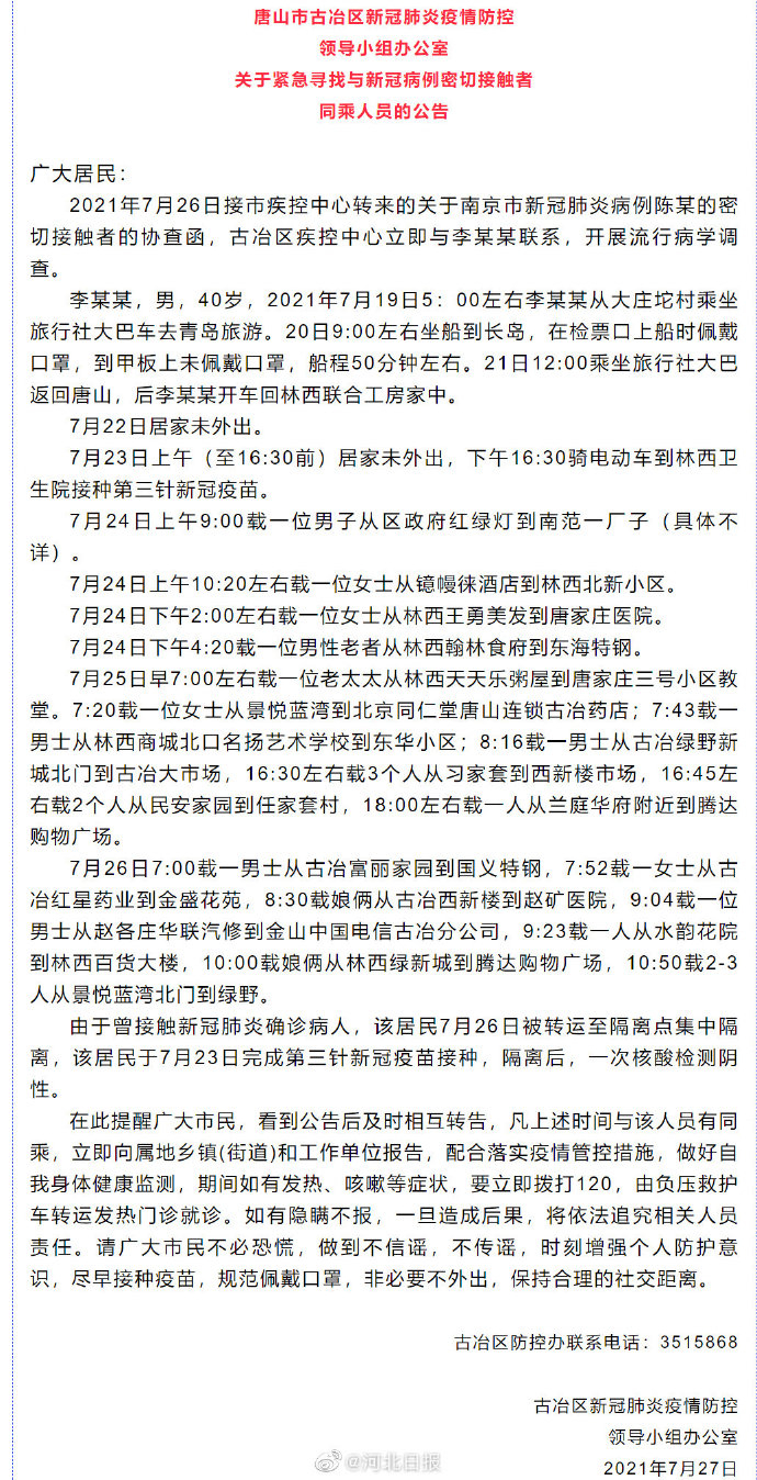 原标题:唐山古冶区急寻密接者同乘人员