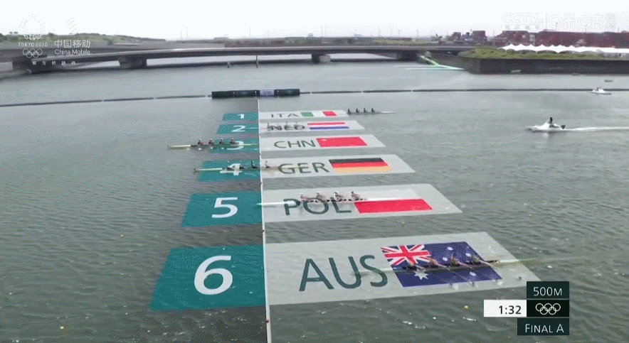 到了最后500米冲刺区,中国姑娘们进一步甩开距离,领先第二名两个半艇位。直播画面中,出现了拍中国队就没其他队,拍其他队就不见第一名的情况。