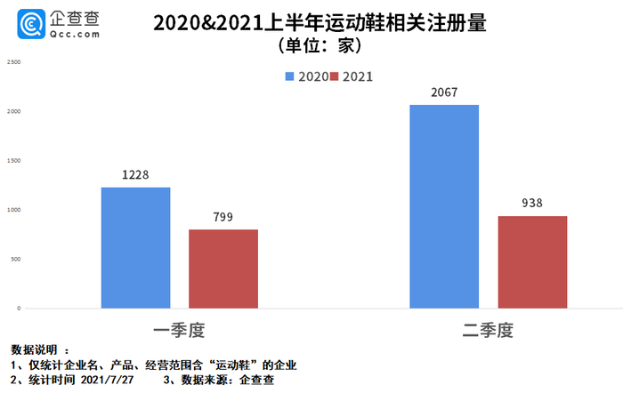 从近两年的注册量来看,2021年上半年,我国运动鞋企业注册量为1737家,同比降低了47.3%。从各季度注册量来看,今年一季度和二季度的注册量均呈下跌趋势。