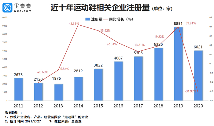 企查查数据显示,从近十年运动鞋相关企业发展状况来看,2019年是企业注册量的高峰期,全年共注册了8851家企业,同比增长了39.9%。2020年注册量为6021家,同比降低32.0%。