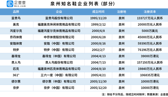 被称为“中国鞋都”的泉州晋江市,曾经承包过一代人的鞋柜。企查查数据显示,我们耳熟能详的知名企业,如安踏、特步、匹克、361°、德尔惠、乔丹、贵人鸟、美克、喜得龙、奈步等12个品牌均在此成立,可以说1995年至2005年是这些品牌创立崛起的黄金十年。其中成立最早的运动鞋品牌有富贵鸟、美克、鸿星尔克等,在众多竞争者中,安踏和乔丹可以说是最脱颖而出的品牌之一,其中安踏体育于2007年7月上市,目前已发展成为国内最大的综合性体育用品企业。