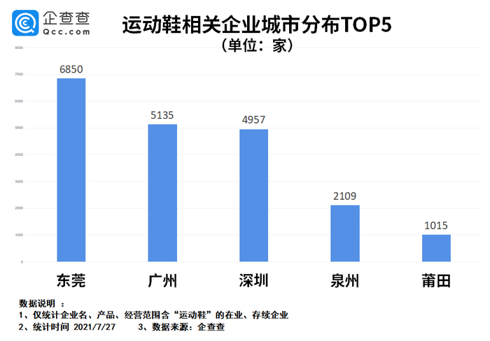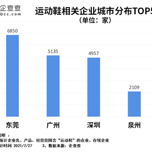 1、运动鞋企业城市分布:东莞第一,泉州跻身前五