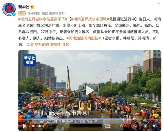 7月26日,卫辉市委宣传部发布消息称,据城市水文专家多点测量,截至7月26日17时,卫辉市水位不再上涨。