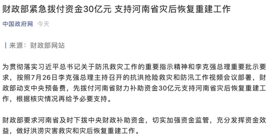 据财政部网站,为贯彻落实习近平总书记关于防汛救灾工作的重要指示精神和李克强总理重要批示要求,按照7月26日李克强总理主持召开的抗洪抢险救灾和防汛工作视频会议部署,财政部动支中央预备费,先拨付河南省财力补助资金30亿元支持河南省灾后恢复重建工作,根据核灾情况再给予必要支持。