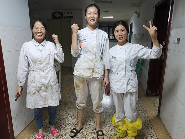 那两天还是最潮湿闷热的,天天一套衣服湿到底,晚上挂起来晾干,第二天白天上班再穿上。我们护士长平均一天还要搬3到4次物资。一场搬运至少要有四五十个人,面包、方便面、火腿肠……从这个人手里递到那个人手里,像接力赛一样。