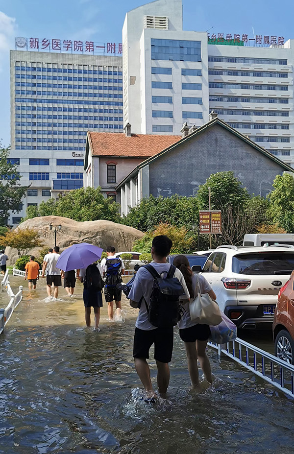 26号上午11点左右,8号楼停电了,急诊和门诊两栋楼最后停电,那是下午4点左右。当时,8号楼结核病区的病人都出院了,电脑也打不开。我和同事坐在办公室窗户往外看水位,看树叶被水泡出来的湿印,(判断)厚不厚,是不是水下降了;又看(路边)标牌上“禁止停车”四个蓝底白字,本来水在字下面两厘米,下班的时候涨了差不多快10厘米,到字的中间。整条学院西路的水位很深,正常的轿车就露一个平车顶了。路上,铲车在一趟趟开过去。