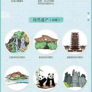 算上泉州,中国现已有56处世界遗产。其中,世界文化遗产38处,世界自然遗产14处,世界文化与自然双重遗产4处。具体名录如下——
