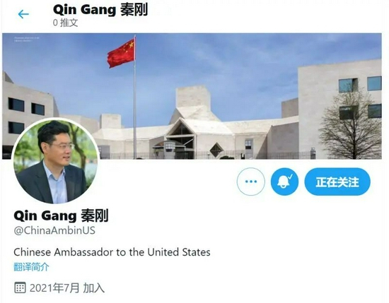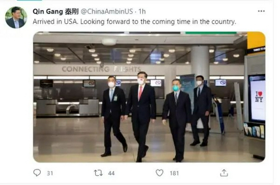 秦刚大使此后发出了自己到任后的第一条推特,内容是:“已抵达美国,期待在这个国家接下来的时光。”配图是自己抵达机场的照片。照片中,秦刚大使所戴的口罩上还印有五星红旗的图案。