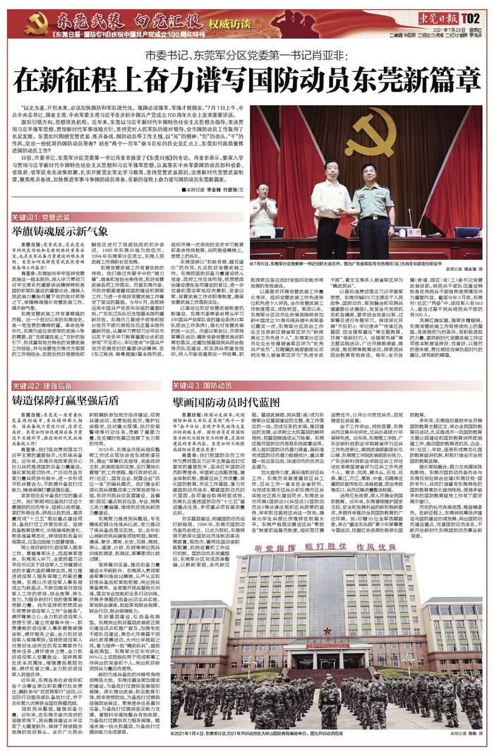 日前,市委书记、东莞军分区党委第一书记肖亚非接受了《东莞日报》的专访。肖亚非表示,要深入学习贯彻习近平新时代中国特色社会主义思想和习近平强军思想,认真落实中央军委国防动员部和省委、省政府、省军区有关决策部署,扎实开展党史军史学习教育,坚持党管武装原则,完善新时代党管武装制度,聚焦练兵备战,加快推进军事斗争国防动员准备,在新的征程上奋力谱写国防动员东莞新篇章。